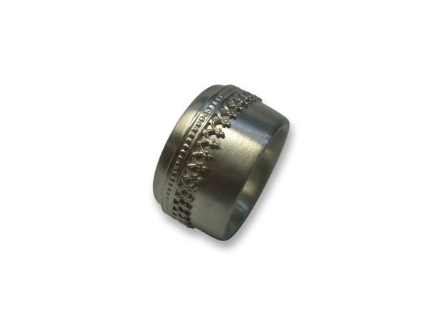 935er Silberring mit Drahtbelötungen. Draht kann bündig an einer Seite angelötet werden; in der Mitte oder versetzt aus der Mitte. Ring ist in verschiedenen Breiten lieferbar.