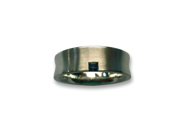 935er Silberring mit Saphir. Ringschiene ist konkav geformt. Saphir wird an drei Seiten von der Ringschiene gehalten.Der Saphir hat einen Durchmesser von 2x2mm. Die Ringschiene ist ca. 6mm breit.